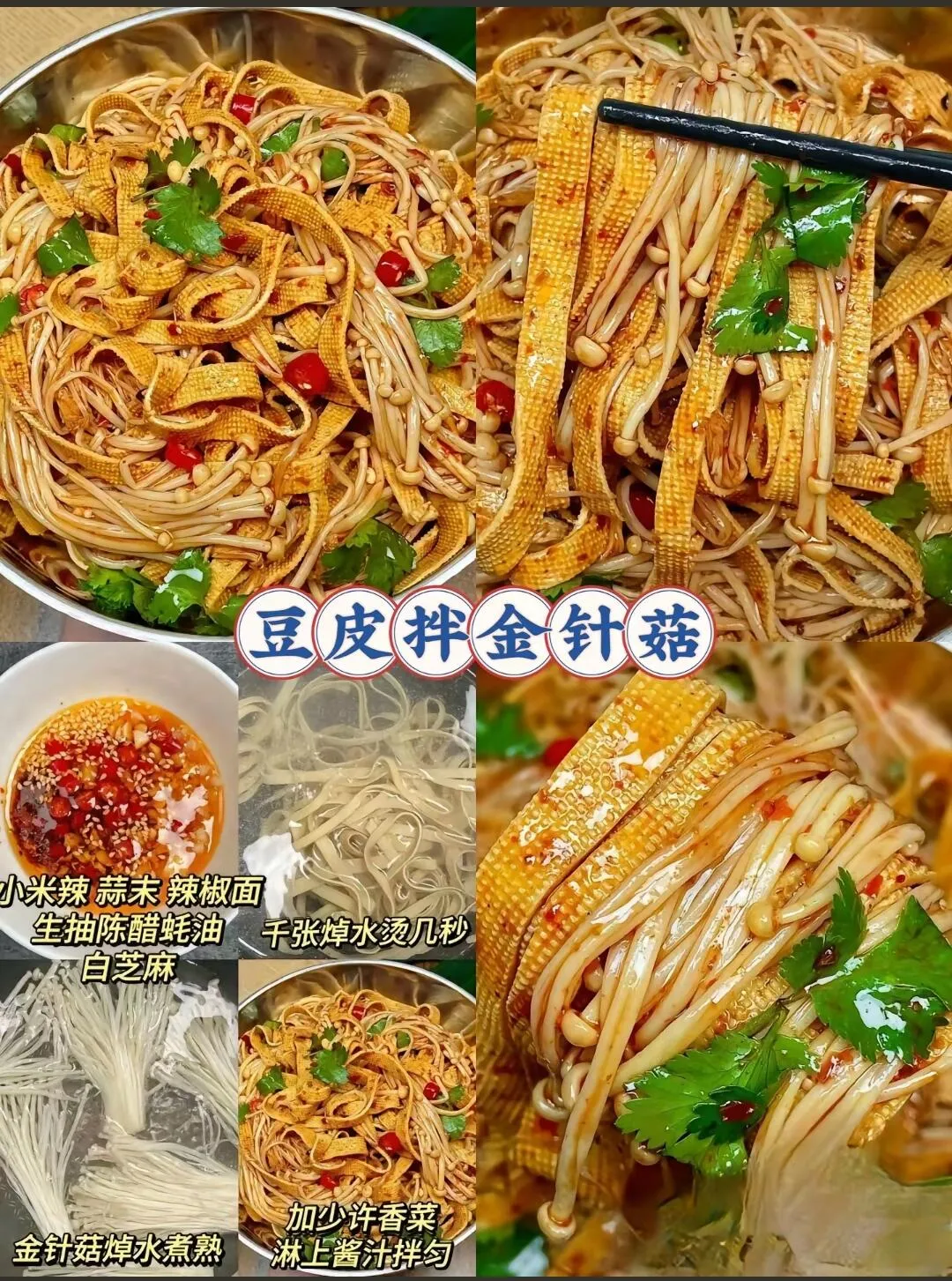 这道菜简直是减脂期的神器!豆皮和金针菇的搭配,口感爽滑,低脂又美味。只需要将豆皮焯水烫几秒,金针菇煮熟,再加入小米辣、蒜末、辣椒面、生抽、陈醋、蚝油和白芝麻,淋上酱汁拌匀即可。是不是很简单呢?快来试试吧!🎉🎉🔥🔥