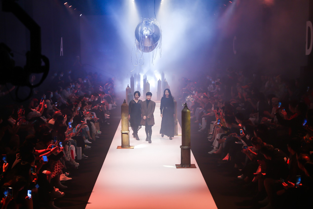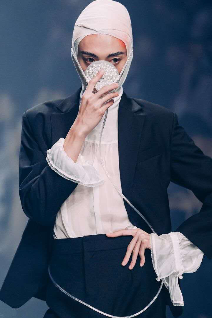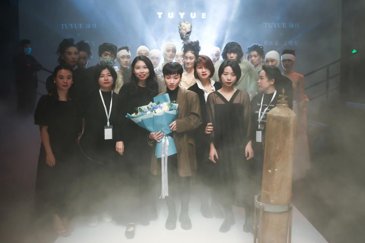 王璜生先生曾在国内外多家文化机构及美术馆举办个展,作品为英国牛津大学阿斯莫林博物馆、英国国家博物馆、英国V&A博物馆、意大利乌菲齐博物馆及中国美术馆、苏州博物馆等各大艺术机构收藏。获法国政府及意大利总统颁发的“骑士勋章”,现为中央美术学院教授,博士生导师,广州美术学院美术馆总馆长。艺术家用氧气瓶作为关键意象,并通过敲击、悬挂等方式来提示生命坚韧与脆弱的双重意义时。当杨盈盈看到王璜生先生在上海龙美术馆的《呼吸》这件作品时感到十分震撼。这种对于生命不息却又充满危机的揭示与她构思的春夏系列《夸父》中心观念不谋而合,于是她向艺术家提出邀请。 杨盈盈回忆:“当时是晚上10点多,我很忐忑的发了信息给王璜生先生,问可不可以做一次跨界合作。没想到他很爽快的答应了。我们提前做好充足的沟通,并落实到每个细节。为此我们开了很多会。王璜生先生很开放且包容,过程中教了我很多东西。他还为这次呈现,制作了一个长达7米半的氧气瓶悬挂装置。直到开秀前我们团队还在调试。”经过长达2个月的筹备,「TUYUE涂月」呈现给观众一场震撼的视觉盛宴。 在秀前序厅内正中央,悬挂着一个巨大的氧气瓶装置,瓶口正面朝向观众,地面上错落摆放20个氧气瓶,在昏暗的灯光,斑驳的剪影与迷离的水雾间,让人错觉置身于美术馆展厅,而非秀场。模特头缠着纱布,戴着氧气罩,如移动的雕塑穿行在林立的氧气瓶间。