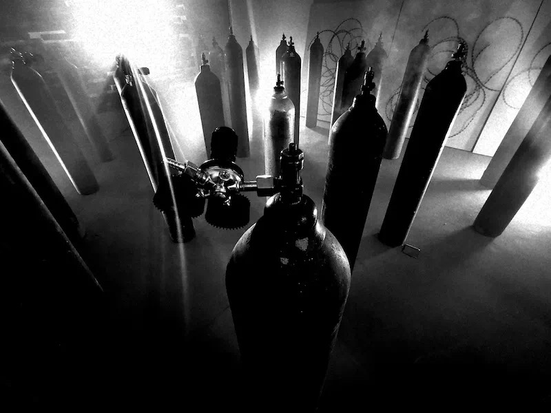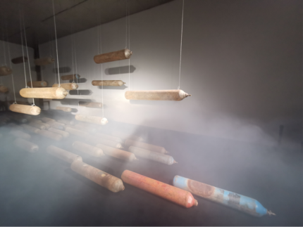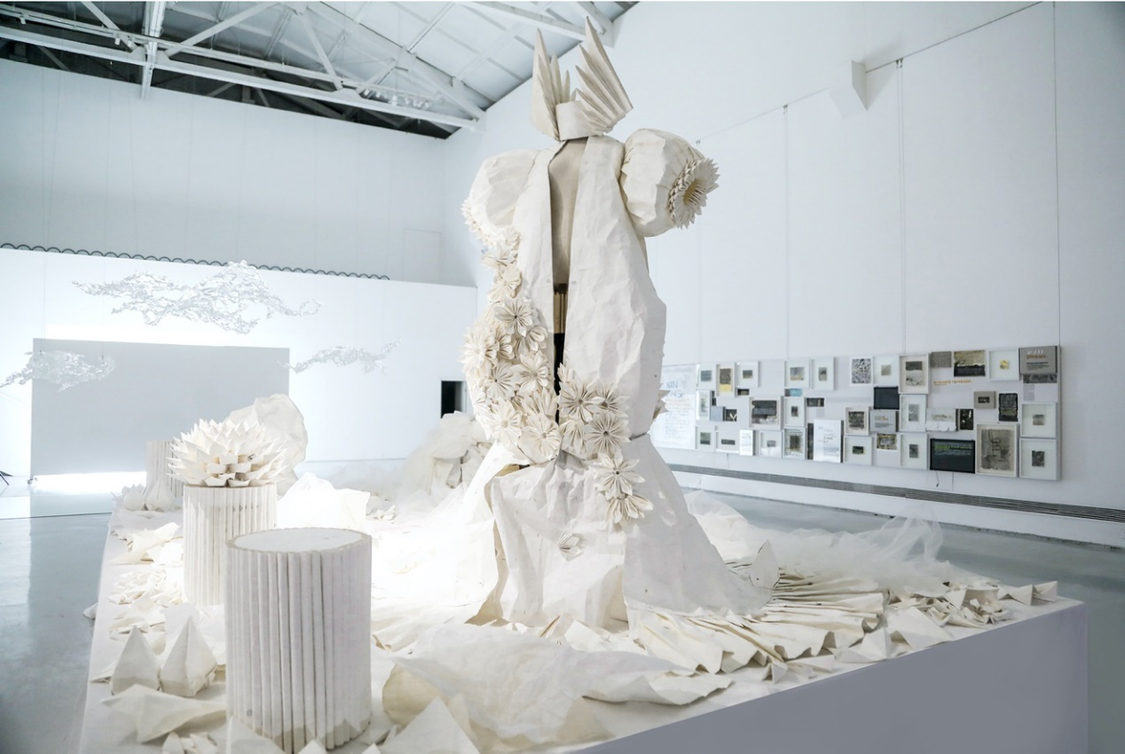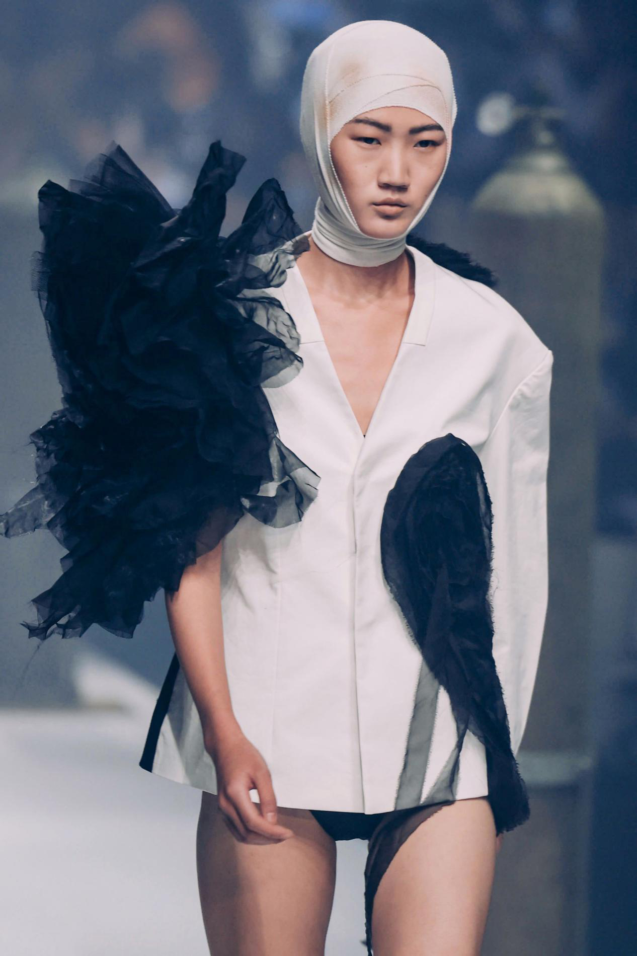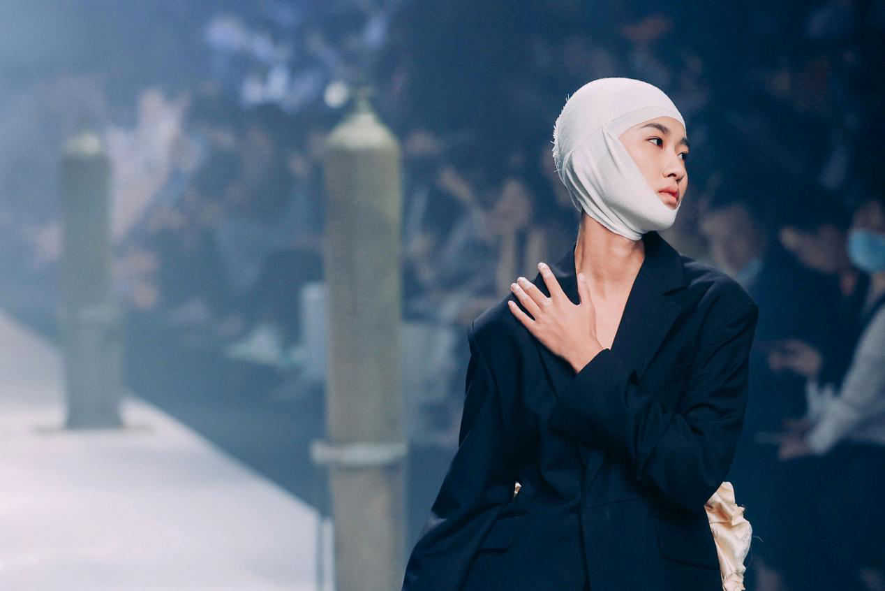 王璜生先生曾在国内外多家文化机构及美术馆举办个展,作品为英国牛津大学阿斯莫林博物馆、英国国家博物馆、英国V&A博物馆、意大利乌菲齐博物馆及中国美术馆、苏州博物馆等各大艺术机构收藏。获法国政府及意大利总统颁发的“骑士勋章”,现为中央美术学院教授,博士生导师,广州美术学院美术馆总馆长。艺术家用氧气瓶作为关键意象,并通过敲击、悬挂等方式来提示生命坚韧与脆弱的双重意义时。当杨盈盈看到王璜生先生在上海龙美术馆的《呼吸》这件作品时感到十分震撼。这种对于生命不息却又充满危机的揭示与她构思的春夏系列《夸父》中心观念不谋而合,于是她向艺术家提出邀请。 杨盈盈回忆:“当时是晚上10点多,我很忐忑的发了信息给王璜生先生,问可不可以做一次跨界合作。没想到他很爽快的答应了。我们提前做好充足的沟通,并落实到每个细节。为此我们开了很多会。王璜生先生很开放且包容,过程中教了我很多东西。他还为这次呈现,制作了一个长达7米半的氧气瓶悬挂装置。直到开秀前我们团队还在调试。”经过长达2个月的筹备,「TUYUE涂月」呈现给观众一场震撼的视觉盛宴。 在秀前序厅内正中央,悬挂着一个巨大的氧气瓶装置,瓶口正面朝向观众,地面上错落摆放20个氧气瓶,在昏暗的灯光,斑驳的剪影与迷离的水雾间,让人错觉置身于美术馆展厅,而非秀场。模特头缠着纱布,戴着氧气罩,如移动的雕塑穿行在林立的氧气瓶间。