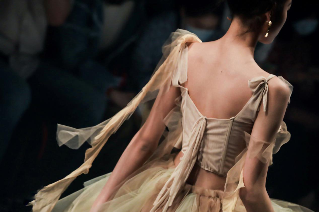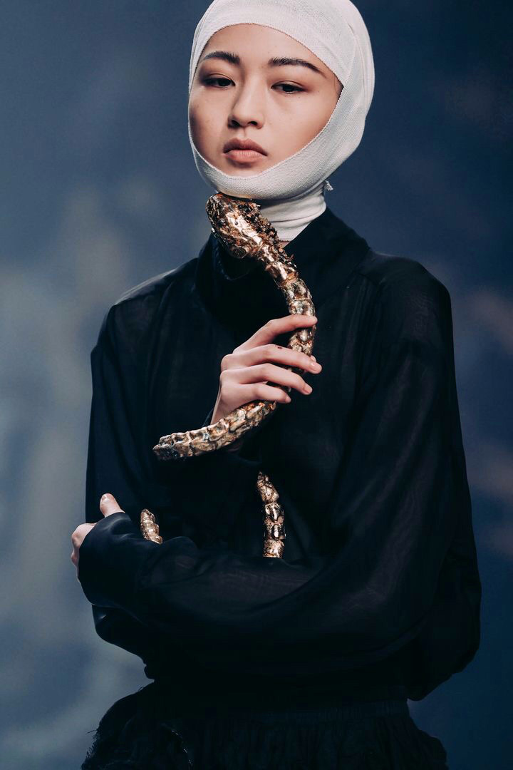 十年国内先锋独立设计师品牌「TUYUE涂月」诞生于2008年。创始人杨盈盈在过往的十来年,曾先后就读于清华经管学院,木兰学院和央美实验艺术学院,以艺术家身份参加当代艺术展览。她自我定位是一个艺术工作者。服装是她艺术创作其中的一种表达媒介。杨盈盈曾经历了一段焦虑期。那段时间疲于与时尚赛跑,也疲于表达。疫情期间,多了时间思考和阅读,反而有了“向死而生”的觉醒。于是她决定做一件很想做的事情——完全遵循内心的喜好做一个系列,在服装设计中注入艺术创作的自由,并参加时装周。 她设想做基于一个英雄的故事做个系列,记录这段时间。翻阅资料的时候,无意看到小时候读过的《夸父逐日》。夸父为了拯救苍生,在透彻灵魂的痛苦中保持奔跑;追逐的过程,交织着生命的消失和生存的渴望。这种充满中国式浪漫的悲剧英雄主义故事,恰好击中她心里那个点。流动的雕塑杨盈盈曾经在北京悦美术馆展出过一件服装的大型装置。服装可以展出在美术馆,雕塑同样也可以走进秀场。把服装制成雕塑,把秀场边为一场装置艺术,模特穿着服饰走动就是流动的雕塑。「TUYEUE涂月」擅长充满力量感与浪漫至极的时装,TUYUE涂月本季发布高定系列,在设计中大量运用了立裁,解构,堆叠等手法,把「戏剧化」强烈演绎。与往季强调夸张「艺术感」不同,本季的宗旨再次强调「TUYUE涂月」自身的样貌。「TUYUE涂月」本季成衣面料均由「TUYUE涂月」团队染织制造。如系列中黄色真丝,是用铁锈腐蚀白色面料染织而成,用深浅不一的色斑来表达夸父攀山涉水后残留的痕迹。用矿物和植物晕染纱幔,营造群山连亘,云遮雾绕之感。把染织面料制成成衣,用艺术表现手法对成衣进行破坏和改造。比如灼烧,撕裂,泥浆,腐蚀,强调“夸父”奔跑过程中的幻化。其中开场的大廓形连衣裙,在拼结处巧妙的加上红色手术缝合线,暗示伤痛后的愈合。为了让故事叙述更加完整,走秀时使用的所有配件为「TUYUE涂月」团队手工制作。“夸父”手中的头像权杖,从塑形到钉珠,花费设计师杨盈盈15个小时,可称之为艺术。