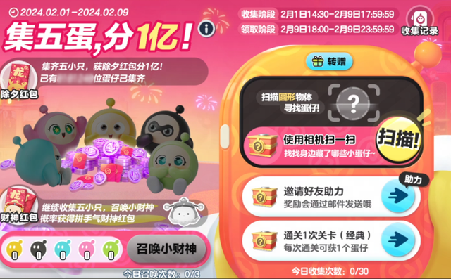 佳节将至,五小只邀请小财神来蛋仔岛给大家拜年啦!【集五蛋分1亿】活动将于2月1日正式上线,蛋仔们只要在2月9日前集齐五小只,就可合成除夕红包并瓜分1亿彩虹币!蛋仔们只需完成简单任务、邀请好友助力,或是使用更轻松方便的【AR扫一扫】途径,就可获得随机蛋仔,轻松集齐五小只。