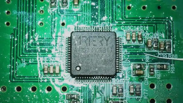 一颗MCU来自ARTERY雅特力,型号AT32F415RBT7,内部集成Cortex-M4 CPU,具备DSP指令集,主频达150MHz。芯片内部集成128KB FLASH和32K SRAM,具备I2C接口,USART接口,SPI接口,CAN接口以及SDIO,芯片采用LQFP64封装。