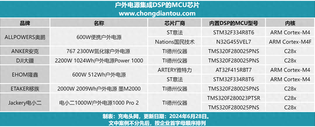 为助力大家清晰了解在户外电源中那些内置DSP的MCU,充电头网整理出6款采用此类MCU的户外电源,并绘制成上表供大家参考。