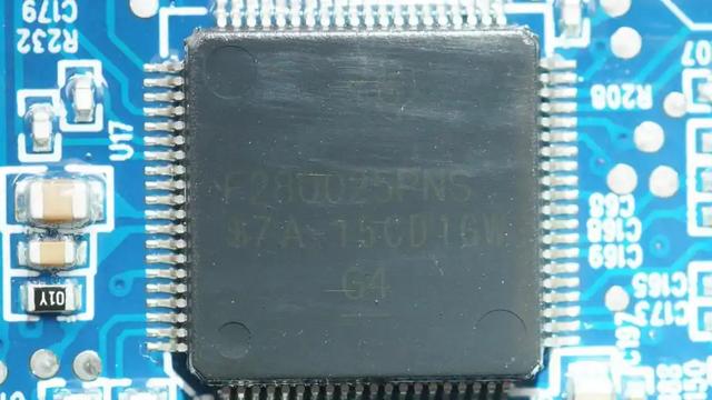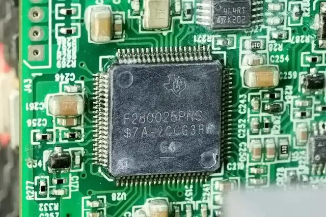 一颗MCU来自TI德州仪器,为C2000系列实时微控制器,型号TMS320F280025PNS,芯片内置32位DSP内核,主频100MHz,内部集成FPU和TMU,内置128KB闪存。可用于工业电机驱动,电机控制,光伏逆变器,数字电源,电动车辆与运输,感应和信号调理用途。