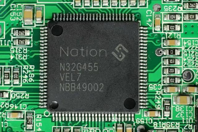 两颗MCU来自Nations国民技术,型号N32G455VEL7,是一颗内置M4F内核的MCU,最高主频可达144MHz,支持浮点运算和DSP指令。芯片内部集成512KB Flash和144KB SRAM,内置4个12位ADC,具备7个USART接口,3个SPI接口和4个I2C接口以及USB接口,采用LQFP100封装。