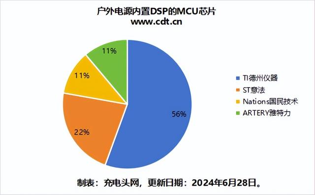 充电头网总结充电头网通过整理以往拆解的40款户外电源后了解到,目前有6款户外电源搭载内置DSP的MCU芯片,其中德州仪器、意法和复旦微分别以50%、20%、10%取得占比前三的位置。另外德州仪器TMS320F280025PNS这款芯片应用次数最高,同时获得4款户外电源采用。