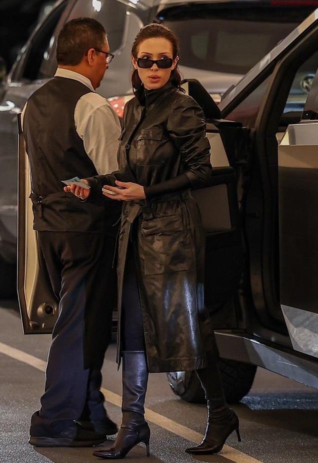 比安卡完全沉浸在魅力四射的氛围中——尽管外面很黑,她仍穿着超高细高跟鞋、梳着大背头、戴着墨镜穿过洛杉矶。而皮革造型一直以来也是金.卡戴珊的最爱——多年来,她时常穿着黑色皮大衣,并总是用配饰和发型来改变造型。