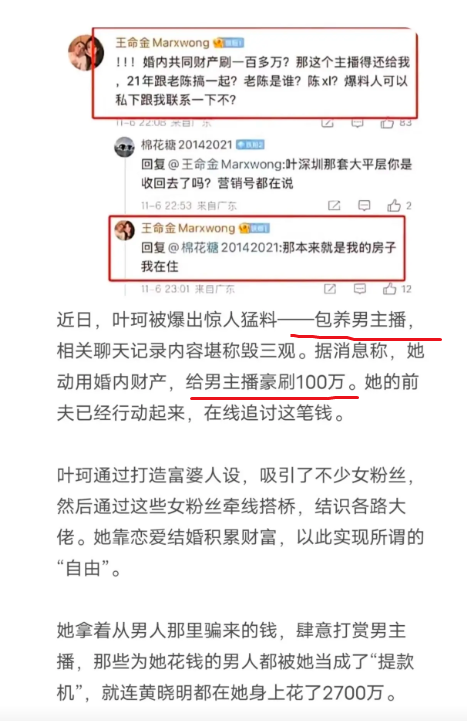 爆料的内容直指叶柯的私生活,称她在与前夫婚姻关系存续期间,与一位名叫“子晨本晨”的男主播关系暧昧,并为其刷了高达一百多万元的礼物。