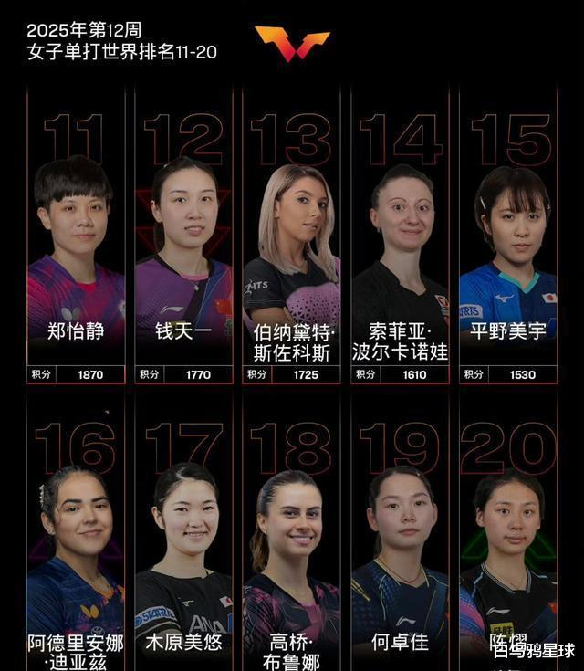在排名第11到第20的选手中,郑怡静表现突出,位居第11。钱天一展现出了不错的潜力,但还需进一步提升。罗马尼亚的斯佐科斯排在第13,波尔卡诺娃紧随其后,位列第14。值得注意的是,平野美宇此次未能进入重庆赛的参赛名单,目前排名第15。