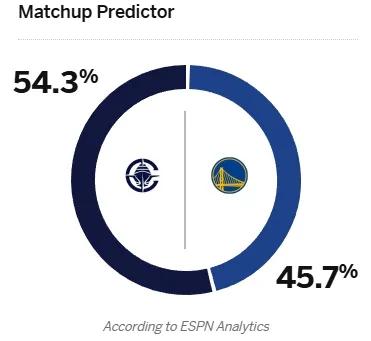 根据ESPN实时胜率的预测,勇士原来胜率为54.1%,现在下降到45.7%,看来外界都看好快船胜,勇士需要用实际表现狠狠地打媒体的脸。