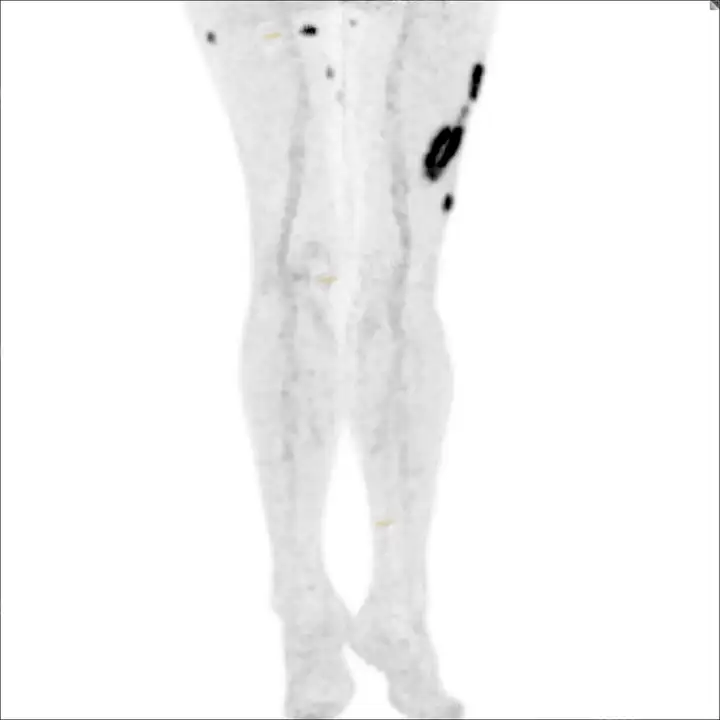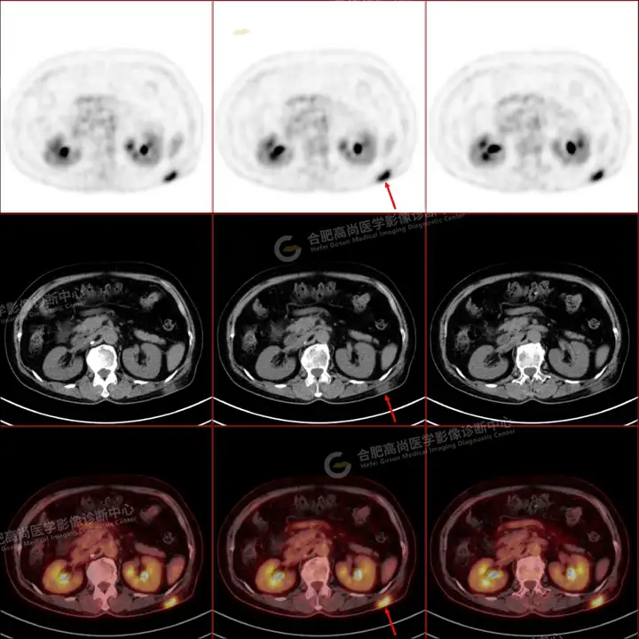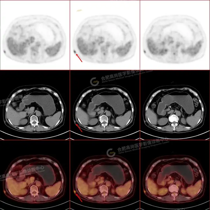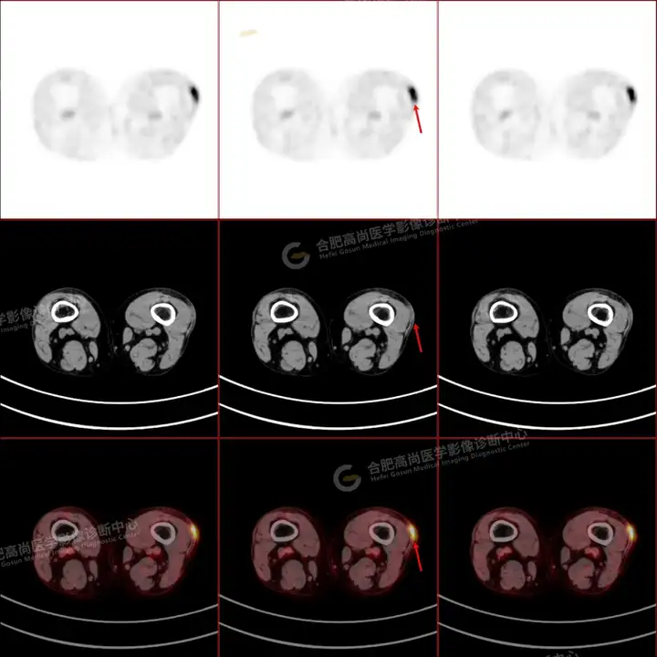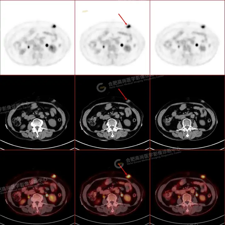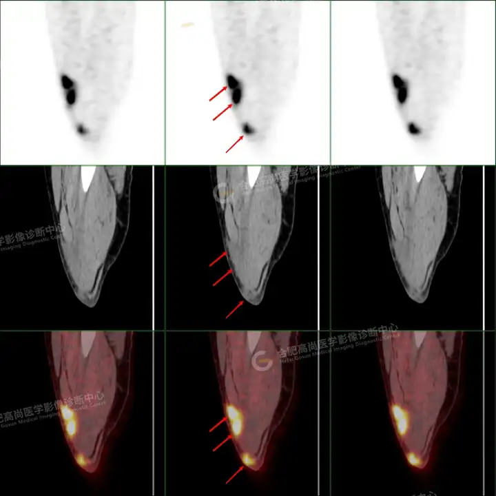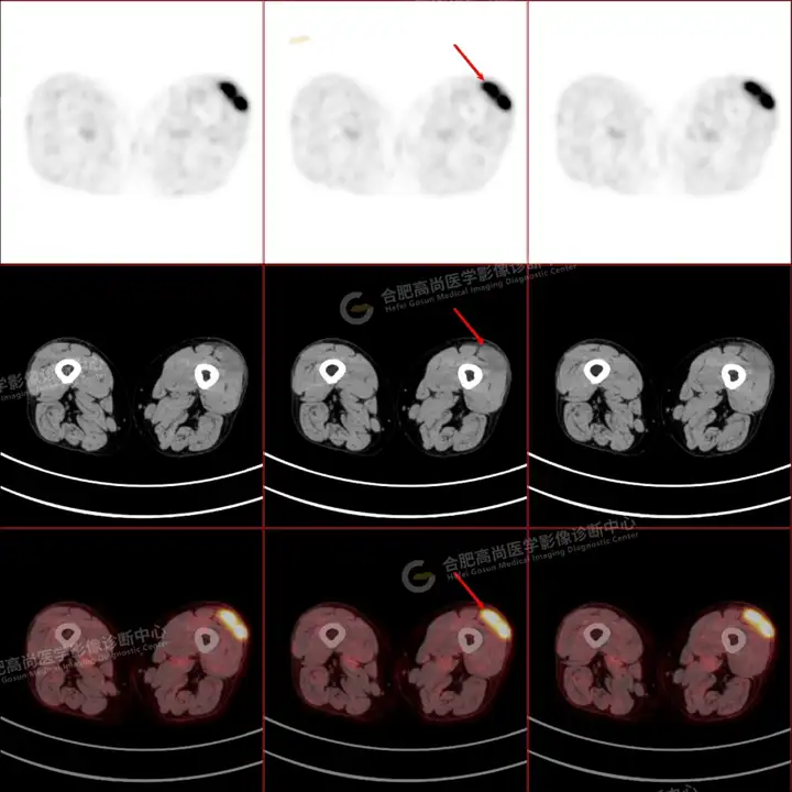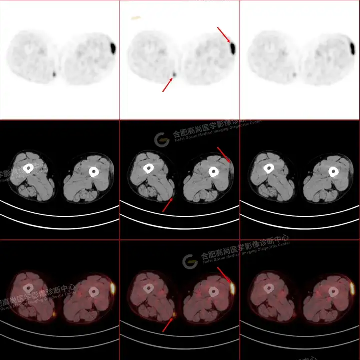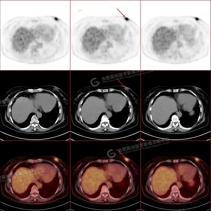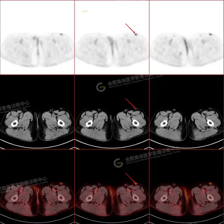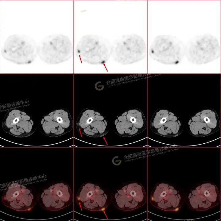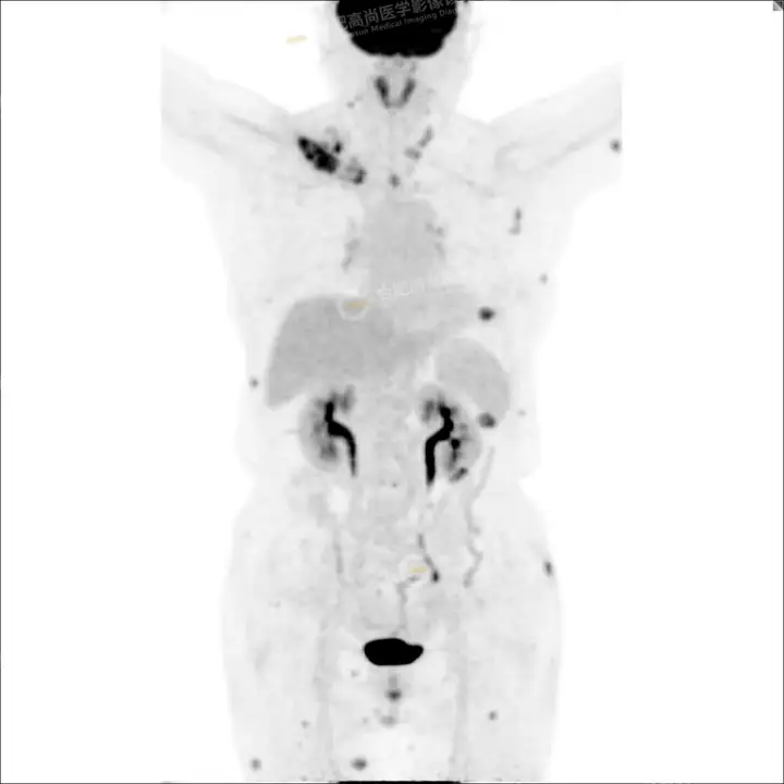 PETCT检查所示:图1、3-17全身多处(双上臂、胸背部、左侧乳腺、左侧腰部、腹壁、双侧臀部及双侧大腿)皮肤下结节及肿块样软组织密度灶,FDG代谢不同程度增高,双侧颈部、左侧锁骨区、纵隔内(1区)及双侧腋窝多发肿大淋巴结,FDG代谢明显增高,符合皮肤来源淋巴瘤。