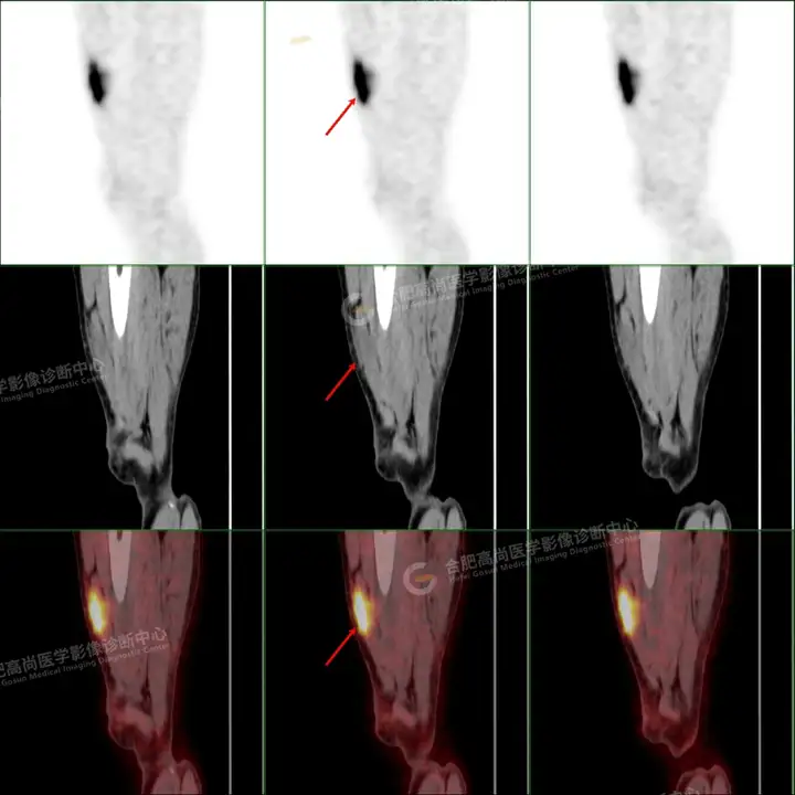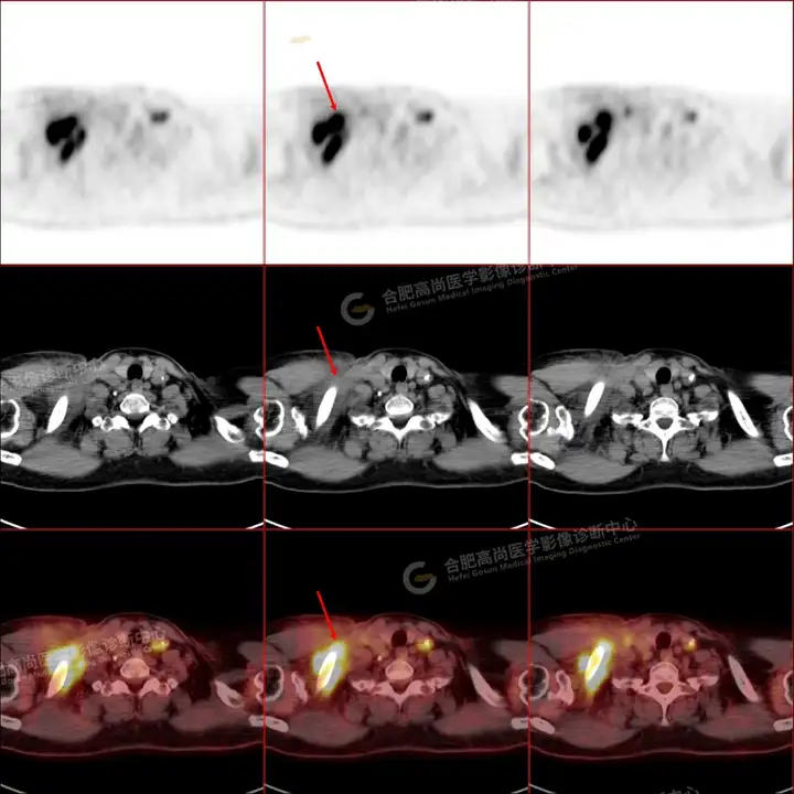 图2右侧颈部包块切除术后,右侧锁骨区术区皮下片状密度增高灶,FDG代谢异常增高,考虑术后炎性反应。