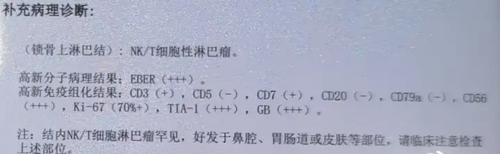 活检病理:右颈部包块活切病理:NK/T细胞淋巴瘤,注:结内NK/T细胞淋巴瘤罕见,好发于鼻腔、胃肠道或皮肤等部位,请临床注意检查上述部位。