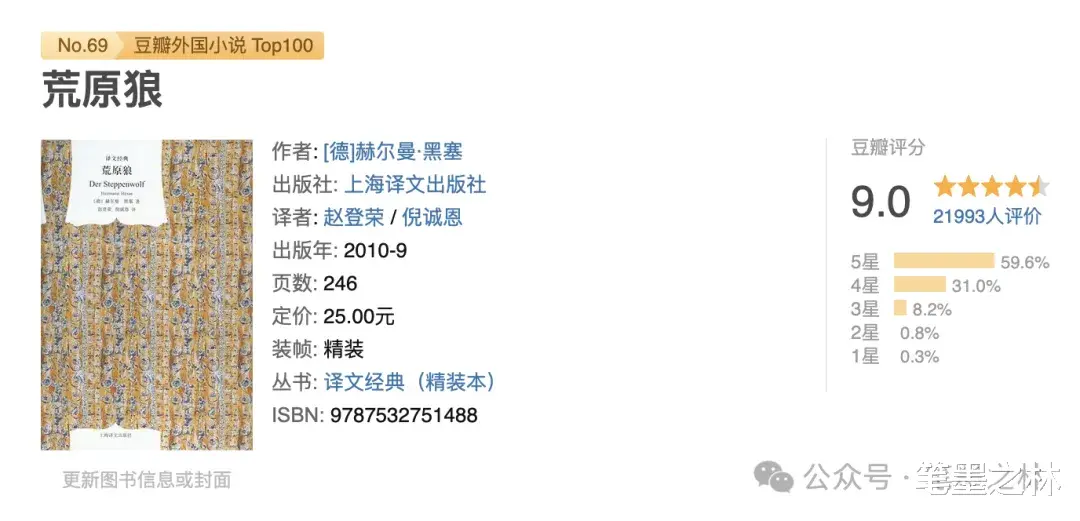 本书地位在前人的版本中已被反复强调——亨利·米勒的最爱;影响了包括电台司令在内的许多名人雅士;在六十年代美国掀起过阅读黑塞的热潮,大学生们人手一册等等。