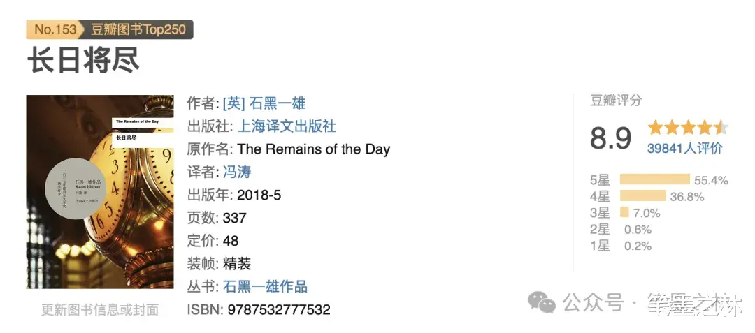 《长日将尽》是诺奖得主石黑一雄1989年获布克奖的作品,也是石黑一雄最重要的代表作。小说以管家史蒂文斯的回忆展开,讲述了自己为达林顿勋爵服务的三十余年时光里的种种经历;虽然达到了职业巅峰,但史蒂文斯过于冷酷地压抑自我情感,追求完美履行职责,而在父亲临终前错过最后一面,之后又与爱情擦肩而过。小说通过主人公的回忆,将一个人的生命旅程在读者眼前抽丝剥茧,同时也折射出一战与二战之间那段非常时期的国际政治格局。
