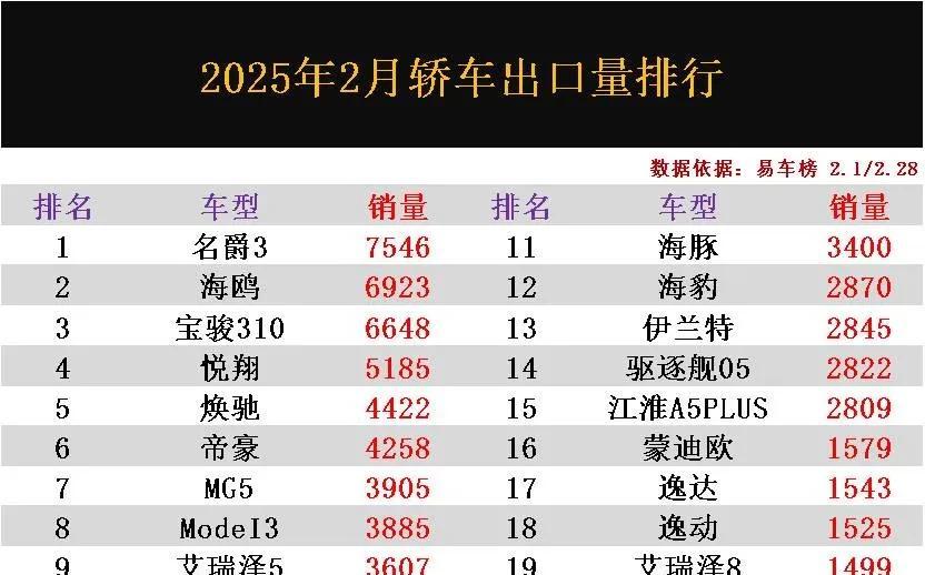 随着全球汽车市场的剧烈变动,国产汽车也迎来了属于自己的春天。2025年2月,中国轿车的出口量排行榜新鲜出炉,这无疑为我们注入了一剂强心针。有人可能会问,国产车真的能够在国际市场上占有一席之地吗?答案是肯定的,依据乘联会的数据,这个月有22款车型的出口量突破了千辆大关,名爵3、海鸥和宝骏310更是稳居前列,引起了广泛讨论和争议。