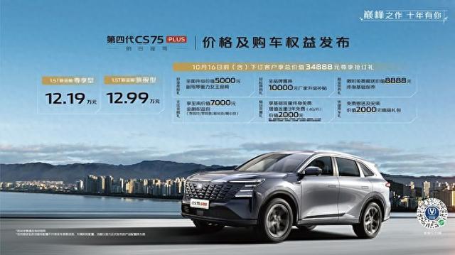 9月24日,长安汽车官方宣布,第四代CS75 PLUS正式上市,此次推出1.5T自动尊享型、1.5T自动旗舰型两款车型,官方指导价分别为12.19万元、12.99万元,配备全新蓝鲸动力1.5T发动机和爱信8AT自动变速器。同时长安汽车还公布了丰富的购车权益:即日起至10月16日(含)下订第四代CS75PLUS的用户可享总价值34888元的六重豪礼。包含:全品牌置换升级,厂家补贴10000元;限时免费赠送终身基础保养,价值8888元;尊享多种金融组合权益包,至高价值7000元;全面升级副驾零重力女王座椅,价值5000元;以及流量、精品综合礼包,价值4000元。