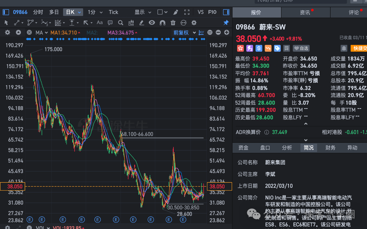 从前复权价格来看,蔚来汽车港股股价曾在2022年9月的时候创出历史新高的175港元/股,此后,公司股价就持续在下滑,虽然中间有所回升,但都只是下跌中继,截至目前,蔚来汽车的港股股价已经跌至了38.05港元/股,期间跌幅超过78%。