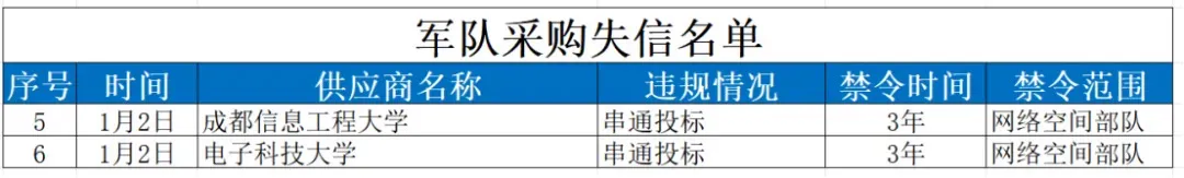 据军队采购网2025年1月初公布的处罚名单显示,电子科技大学和成都信息工程大学因涉及串通投标行为,被暂停军队采购资格三年。此次处罚不仅涉及这两所川渝地区的知名高校,还包括11家因各类违规行为被处罚的企业。