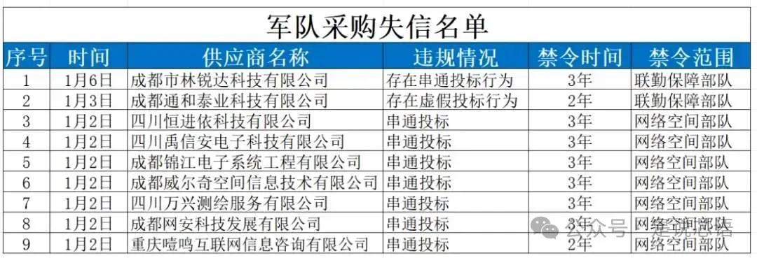除了这两所高校,还有11家企业因涉及串通投标、虚假投标等多种违规行为被军方处罚。其中,成都锦江电子系统工程有限公司和成都网安科技发展有限公司都是军民融合领域的重要企业,成都网安科技更是国家级专精特新“小巨人”企业。此外,成都市林锐达科技、成都通和泰业科技、四川恒进依科技等多家企业也因串标或虚假投标等问题被处罚,处罚期限从两年到三年不等,且都包括对法定代表人和授权代表的限制。