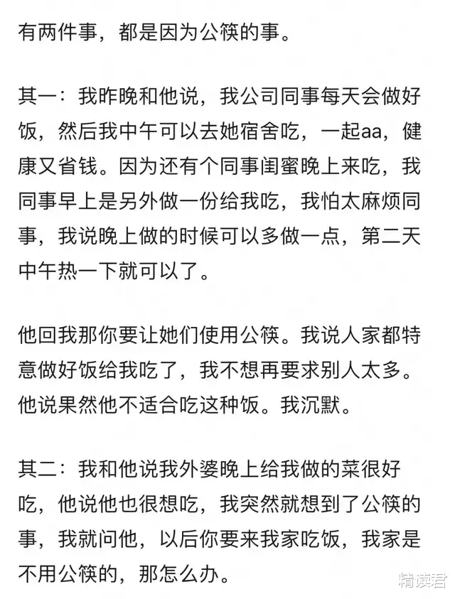 题主和男友之间因为两件事发生了摩擦,这两件事,都是因公筷而起。