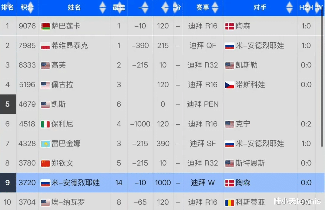 再来关注目前WTA冠军积分排行榜,目前的前十名中,澳网冠军凯斯第1,迪拜冠军安德列娃第4,多哈冠军阿尼西莫娃第7。