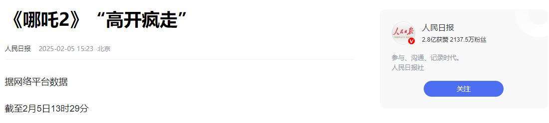 在文章标题处,人民日报就用上了“高开疯走”来形容《哪吒2》的票房奇迹。