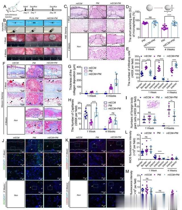 本研究使用大鼠皮下注射模型验证了复合材料的注射性能(图 6A)。mECM 水凝胶在注射器中呈乳白色,没有沉积或分离迹象。装入注射器后,PM 组的微球聚集并沉淀在底部。然而,在 mECM + PM 组中,微球与 mECM 水凝胶混合后分散均匀,没有沉淀迹象(图 6B)。在注射过程中,PM 组中单独的微球容易堵塞针头,但 mECM 水凝胶和 mECM + PM 复合物都能顺利注射而不影响流动。注射后,1周后可观察到 mECM 水凝胶、多孔 PLCL 微球和 mECM + PM 复合物。随着植入时间的延长,mECM 水凝胶完全降解,而 PM 组和 mECM + PM 组在第 4 周时仍能检测到微球(图 6B)。H&E 染色显示,宿主细胞大多分布在 mECM 组和 mECM + PM 组材料的外围,而 PM 组的细胞则在第 1 周时迅速渗入微球内部(图 6C)。PM 组的微球在植入 4 周后出现异质降解和塌陷,而 mECM + PM 组的微球则保持了均匀的球形结构,微球之间和微球内部分布着大量细胞和 ECM(图 6C)。微球的短轴/长轴(S/L)值代表微球的变形程度。两组微球的 S/L 值在 1 周时无显著差异,但在 4 周时,mECM + PM 组的 S/L 值明显高于 PM 组(图 6D)。