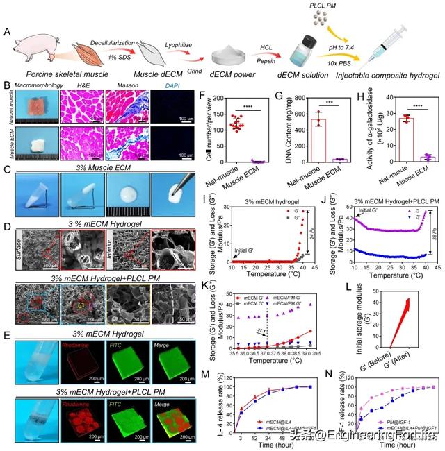 【mECM 水凝胶和 mECM + PM 复合材料的制备和表征,以及 mECM@IL4 + PM@IGF1 的双释放曲线】
