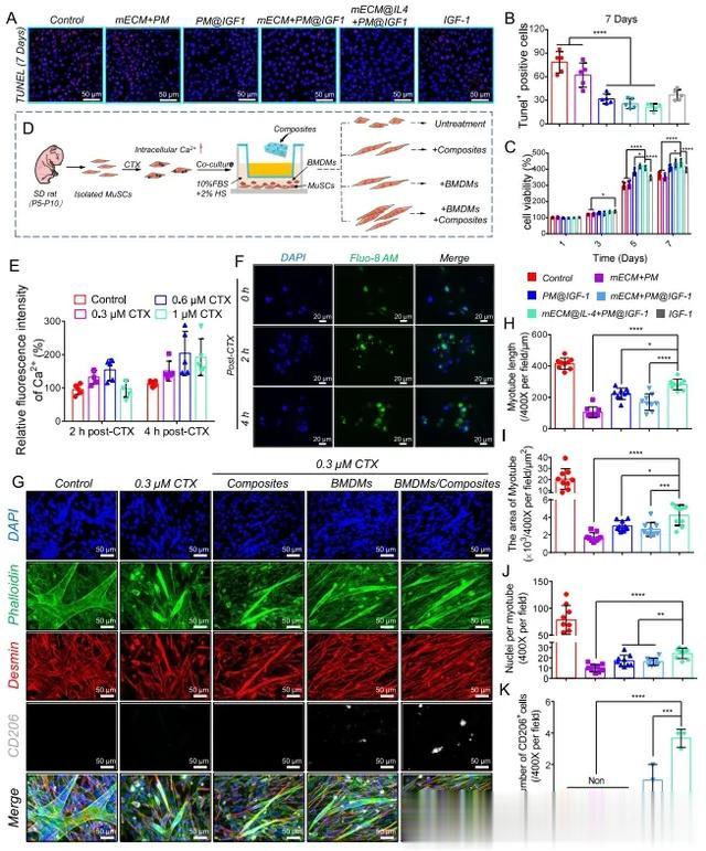 TUNEL染色可用于评估复合材料对L6细胞的抗凋亡作用。在第7天,mECM@IL4 + PM@IGF1组的TUNEL阳性细胞数量低于其他组,这表明与对照组、mECM + PM组和纯IGF-1组相比存在显著差异(图5A, B)。用 CCK8 检测不同处理后 L6 细胞的活力(图 5C)。第 1 天,各组间无显著差异。第 3 天,mECM@IL4 + PM@IGF1 组的细胞活力高于对照组、mECM + PM 组、PM@IGF1 组和 mECM + PM@IGF1 组,低于纯 IGF-1 组,但无统计学差异。第 5 天和第 7 天,mECM@IL4 + PM@IGF1 组的细胞存活率明显高于对照组、mECM + PM 组、PM@IGF1 组和纯 IGF-1 组,与 mECM + PM@IGF1 组相比无显著差异(图 5C)。随后,本研究构建了体外CTX诱导的细胞损伤模型,以研究BMDMs和复合材料对损伤的原代卫星细胞行为的调控作用(图5D)。经 0.3 µM CTX 处理 2.0 ± 0.5 h 后,卫星细胞胞内 Ca2+ 荧光强度增加了 30-40%,表明细胞损伤模型构建成功(图 5E、F)。