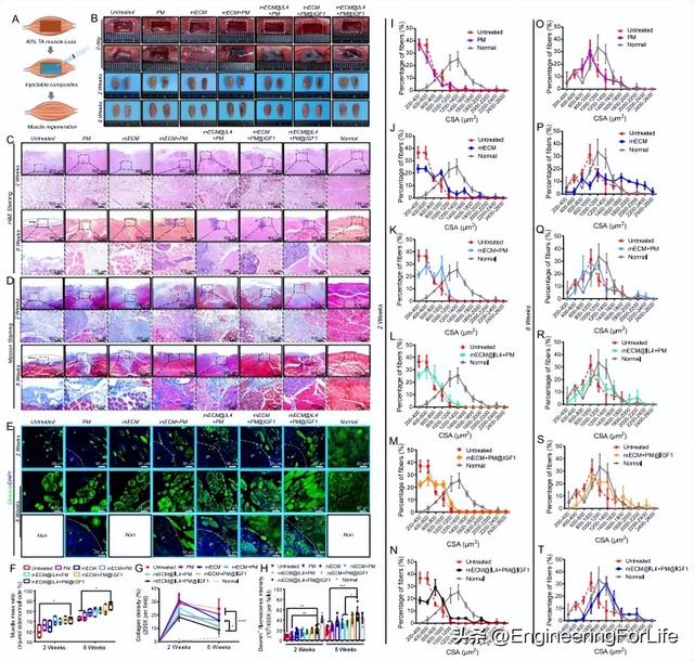 图7 mECM@IL4+PM@IGF1复合材料可在2周和8周后促进体积性肌肉缺失(VML)模型大鼠的肌肉再生