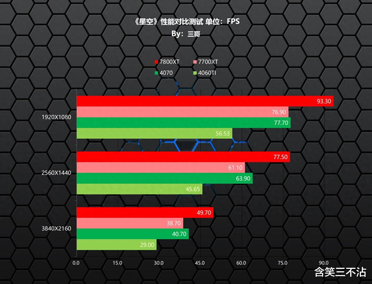 测试结果汇总,可以看出,《星空》对显卡的需求确实比较高,1080P分辨率下,就已经将RTX4060Ti拦到流畅运行的门外了;到了1440P分辨率,大家的帧率都有所下降,好在RX 7700 XT和RTX4070还能维持在60帧以上;至于2160P分辨率,四款显卡都不能保证60帧以上的速度。