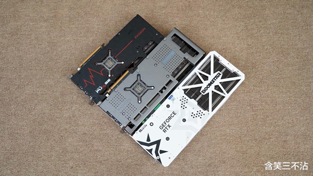 显卡真身一览,蓝宝石 RX 7700 XT 白金版为双风扇设计,蓝宝石 RX 7800 XT 超白金版和影驰 RTX4070 星曜 OC为三风扇设计。