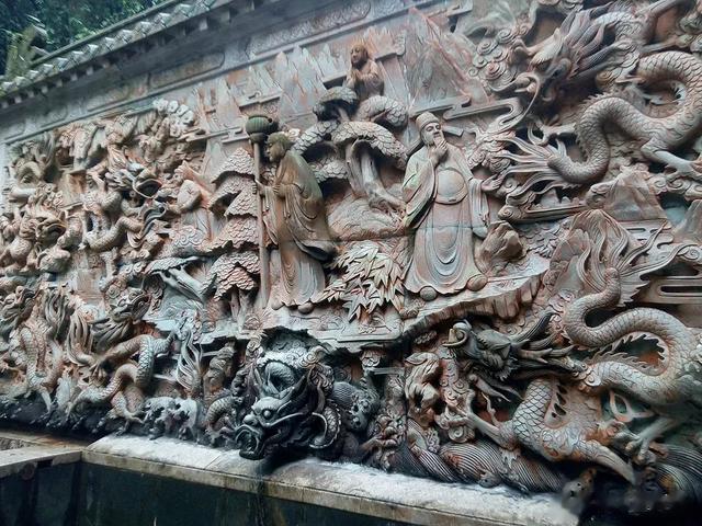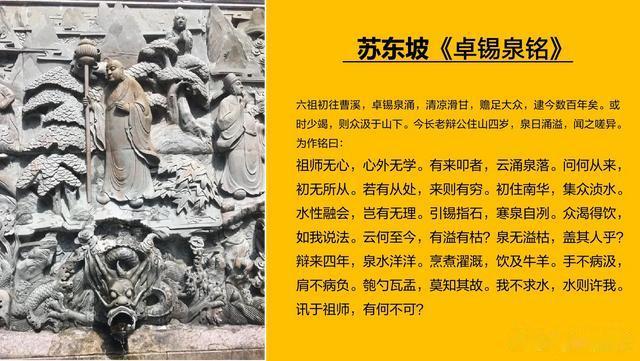 在寺庙后山的卓锡泉,有一组巨大的九龙壁石雕群像。石雕中心的两个人物造像,一个是六祖慧能持杖卓地,另一个就是苏东坡。