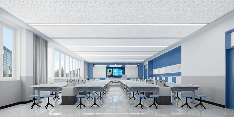 主题风教室则像是一个个神秘的魔法城堡,每一间都藏着独特的学科宝藏。科学教室宛如科幻电影中的未来实验室,银色的金属装饰、充满科技感的灯光线条,还有墙上悬挂的爱因斯坦画像与元素周期表,仿佛时刻在召唤着学生们去探索宇宙的奥秘。艺术教室则是创意的天堂,五彩斑斓的涂鸦墙、错落有致的艺术作品展示架,以及随意摆放的画具与手工材料,一踏入便让人灵感爆棚。地理教室的世界地图地毯、历史教室的复古卷轴壁画,每一处细节都与学科知识紧密相连。在这样的教室里,学习不再枯燥,学生们仿若穿越时空,与知识的创造者并肩同行,知识的种子也在这充满趣味的氛围中深深扎根。