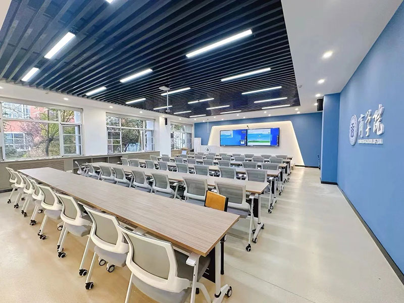 现代简约风宛如一位身着利落西装的都市精英,大步迈进校园。它摒弃了繁琐的装饰,用最直白的线条勾勒出空间的轮廓,每一面墙、每一张桌椅都仿佛在诉说着简洁的魅力。浅灰色的地面与白色的天花板相互呼应,纯净而明亮,阳光透过大大的窗户肆意洒入,将整个教室照得通透明亮。桌椅整齐排列,间距恰到好处,既保证了学生的独立学习空间,又方便小组讨论时的自由交流。在这样的教室里,没有过多的视觉干扰,学生们的注意力自然而然地聚焦在黑板、屏幕与书本之间,学习效率直线飙升。学校的时尚感与进取精神,也在这一方简约天地中展现得淋漓尽致。