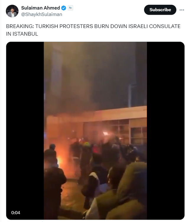 如果说体育圈、娱乐圈还算比较和平的表达自己的愿望,他们希望停止轰炸加沙,给加沙和平。那么,其他地方可就没那么好说话了,在以色列轰炸帐篷区的消息刚刚传出来,愤怒的土耳其人冲向了以色列驻伊斯坦布尔领事馆,放火烧了领事馆(上图)。