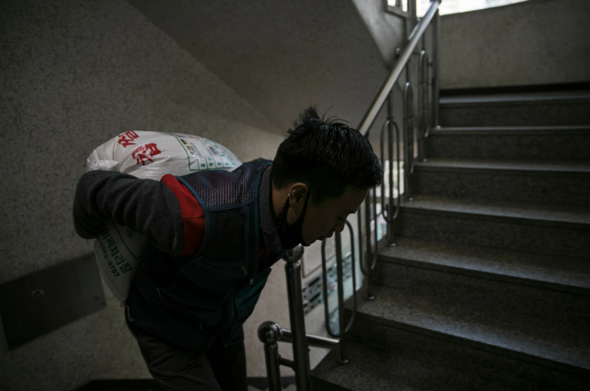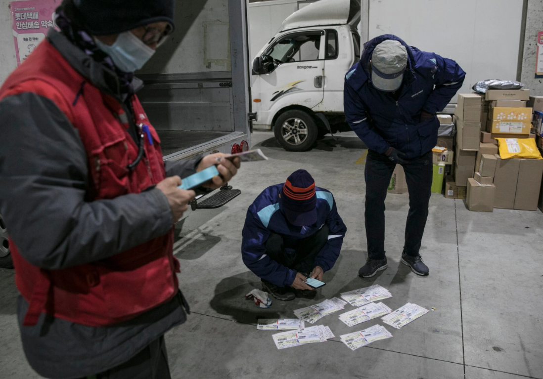 首尔的一位快递员金东熙于10月7日凌晨2点回到家中,还没来得及好好吃饭休息,又回到仓库,取了420个包裹。第二天凌晨4点左右,他给同事发短信时,仍然还有很多快递需要他来送。