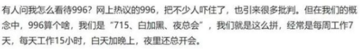 其实资本家们这类“把人当驴来使”的口吻早已屡见不鲜,之前就有某知名餐饮企业老板站出来为“工作福报”说话:996太弱了吧,我们公司的715才算拼。所谓715即,每周工作7天,一天工作15个小时。他们白天上班晚上加班,还半夜开会......