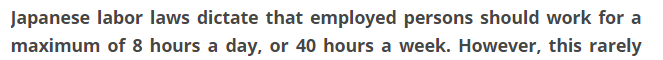 先来看看日本的工作时间:日本劳动法规定,受雇人员每天工作8小时,或每周工作40小时。不过当然,这种情况很少发生,调查发现,超过25%的日本公司每月要求员工加班80小时,其中很多都是年轻员工。