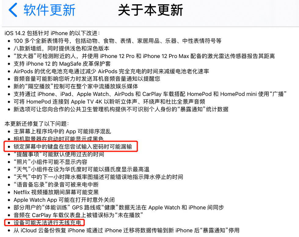 因为在iOS14.2中的更新描述中,修复了一下问题: