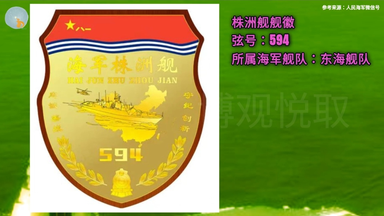 介绍:株洲舰舰徽主体是军舰、直升机和中国地图图案,下方的火车头造型寓意着株洲舰的勇往直前和开拓精神。