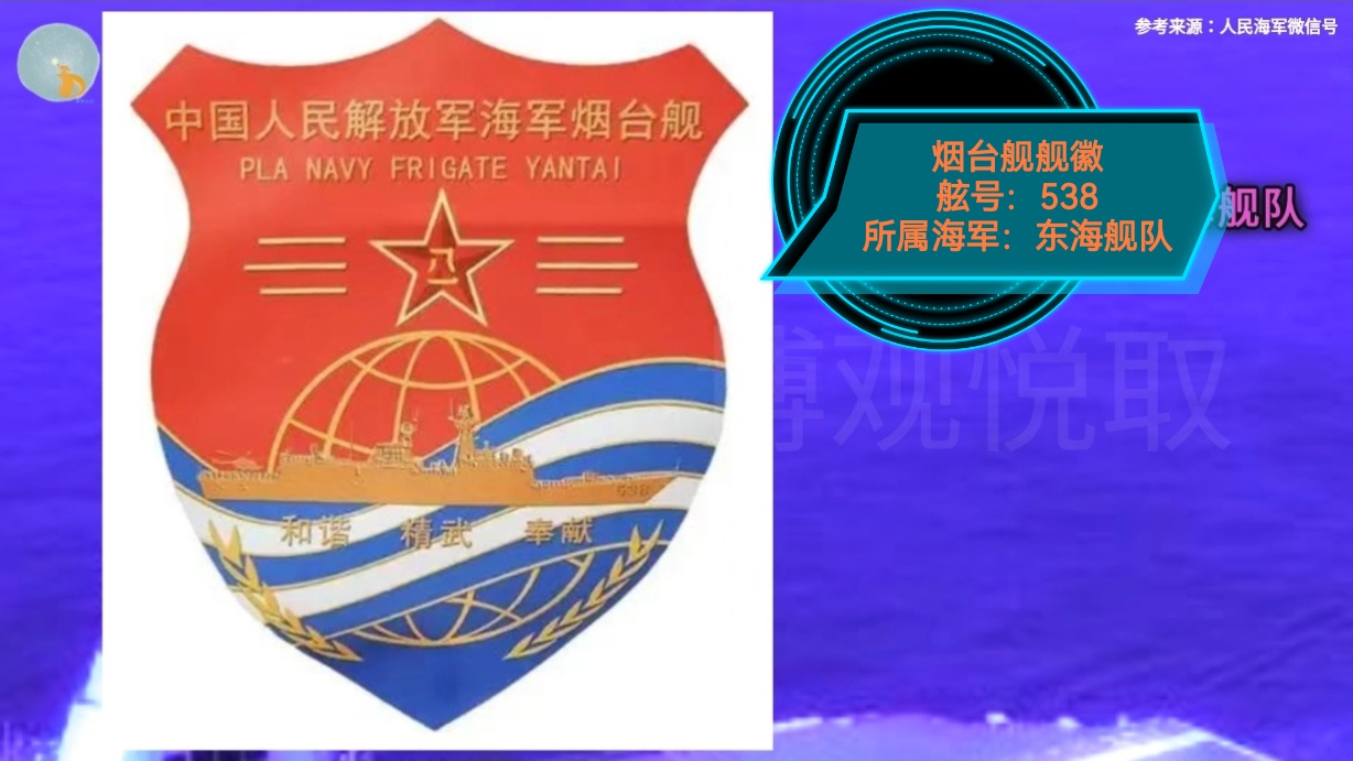 介绍:烟台舰舰徽主体是军舰侧影和地球、麦穗、海浪状的海军旗图案,寓意着烟台舰的全球视野和保卫祖国的决心。