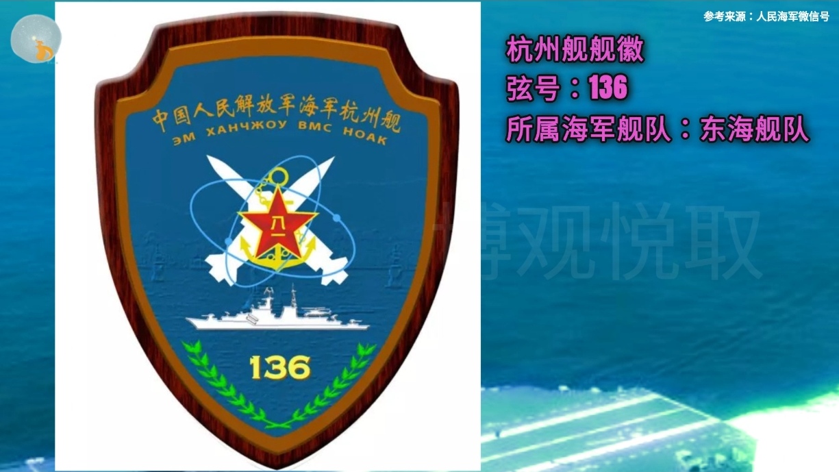 介绍:杭州舰舰徽以“三潭印月”为背景,巧妙融合杭州元素;导弹交叉护卫军徽,彰显反舰防空能力,双语舰名凸显俄系血统。