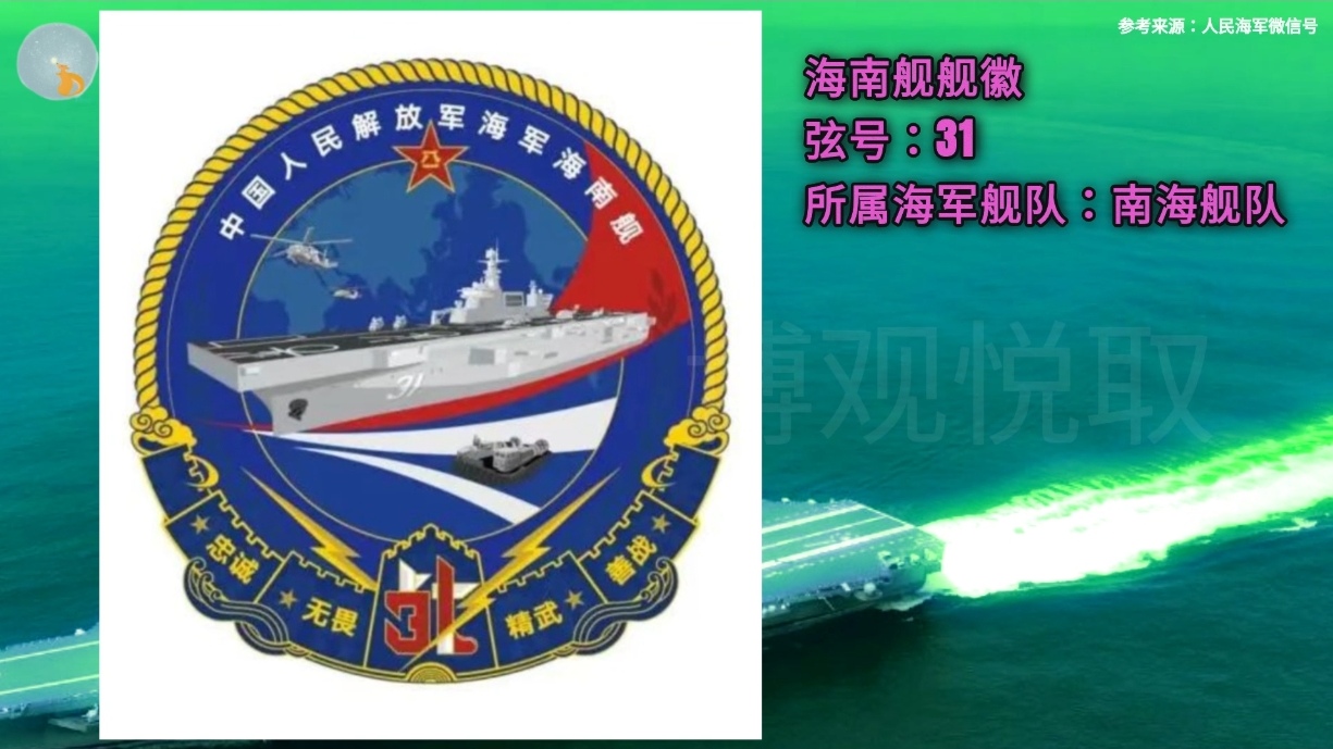 介绍:海南舰舰徽以舰艇从红色驶向前方为创意,寓意着海南舰沿着党指引的方向劈波斩浪,是中国海军海上长城的重要组成。