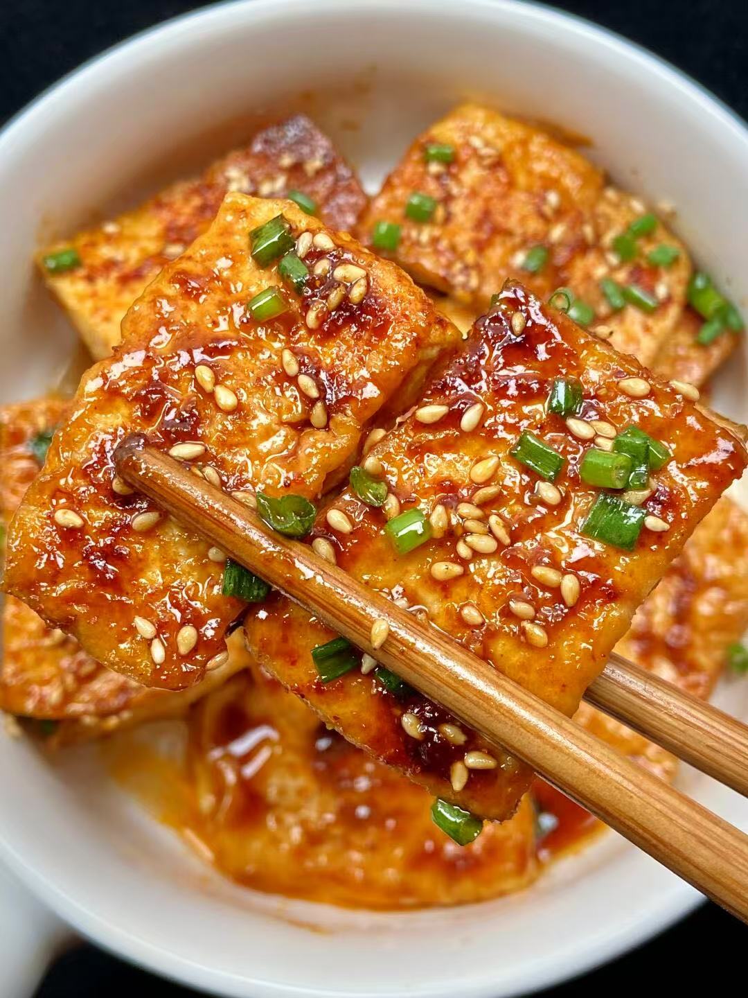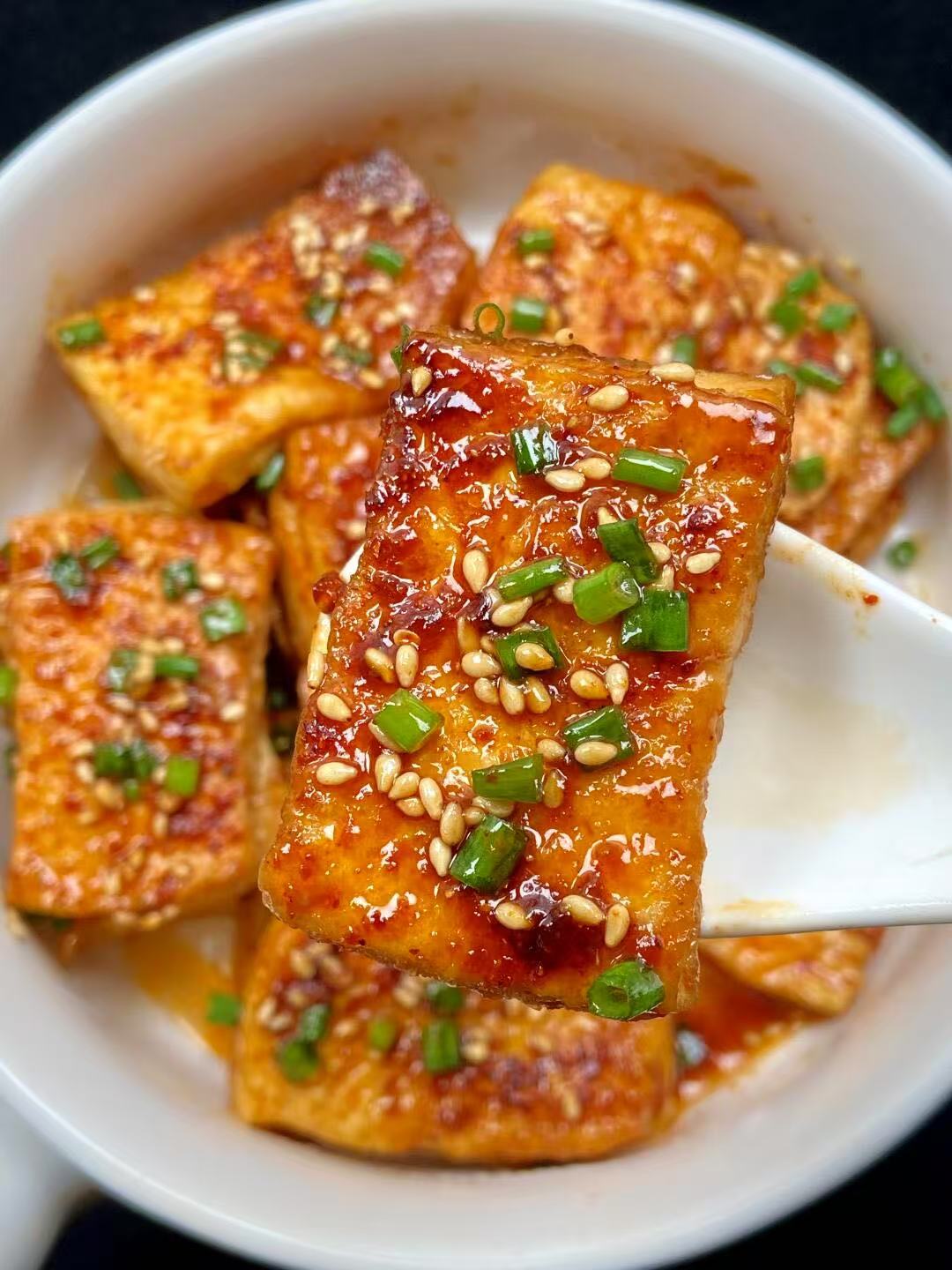 6. 出锅:待豆腐表面光亮,酱汁浓郁,即可关火,盛出装盘,撒上辣椒粉、孜然粉和白芝麻,以及葱花,开吃。