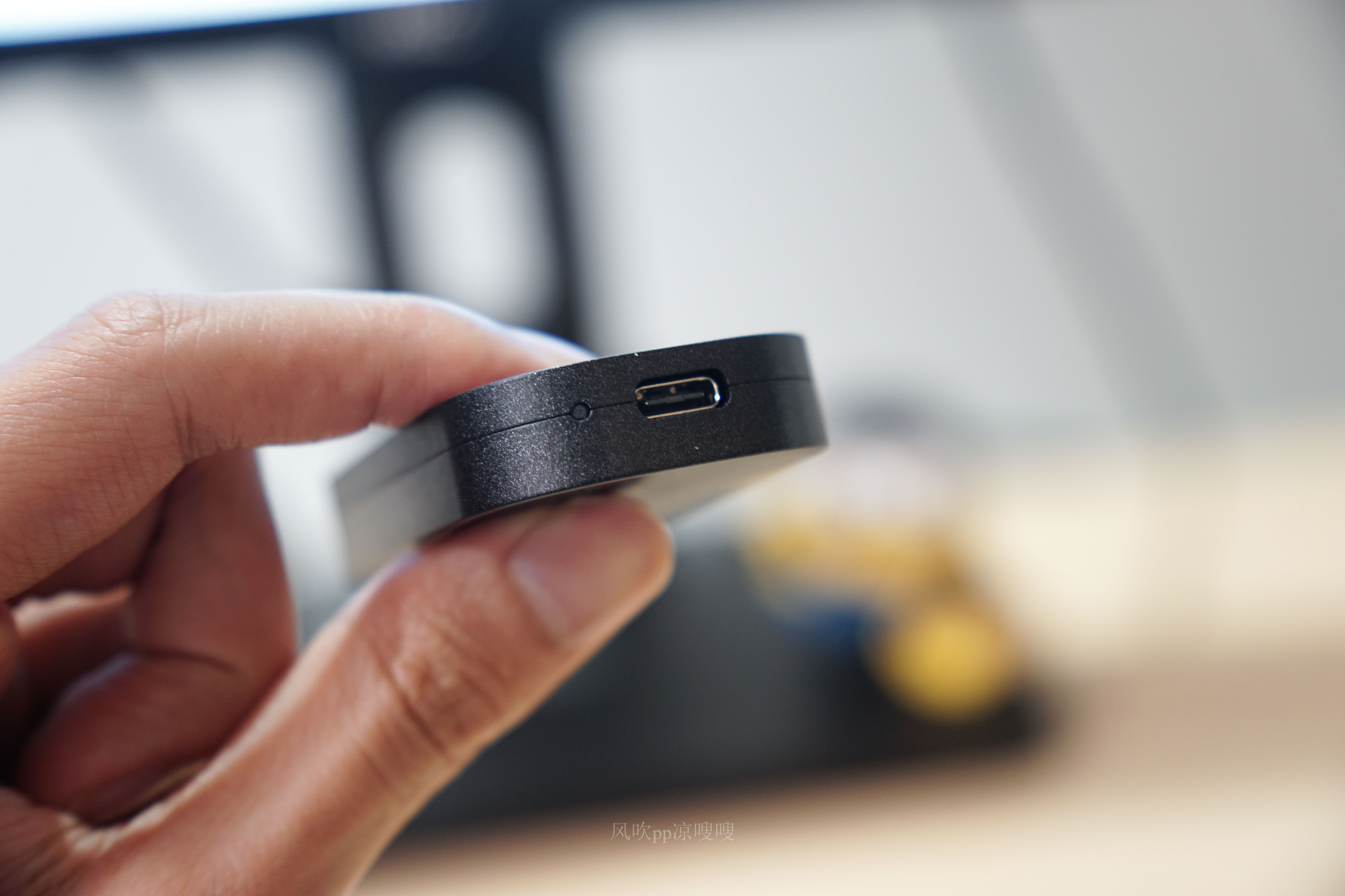 硬盘机身采用了凹面设计,除了带来握持使得舒适度外还进一步提升了抗震防摔性能。整个硬盘三围约为72×40×11.8mm,一只手就能握持。