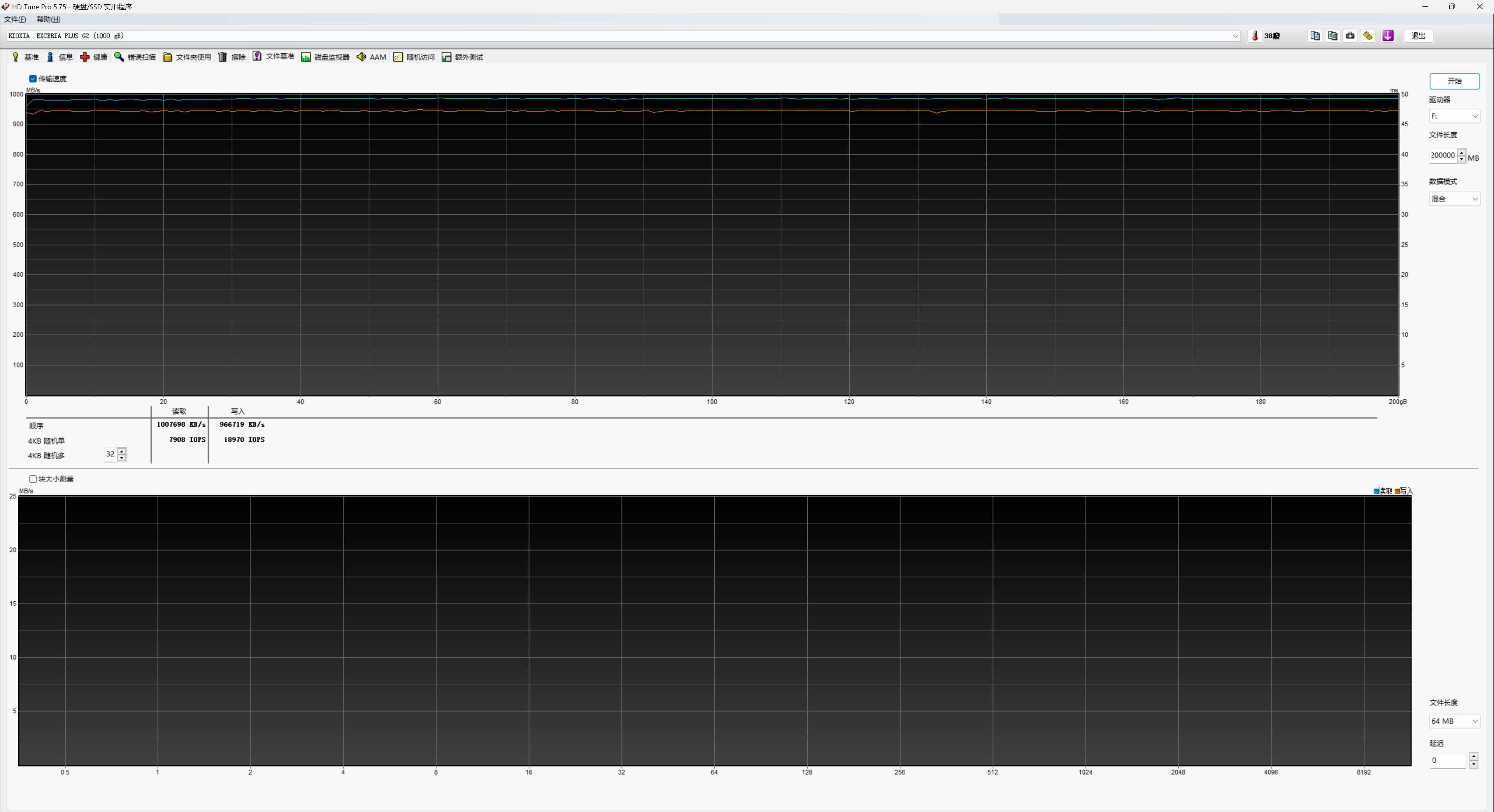 ▼ATTO磁盘基准测试,可以看到当面对4KB体积小文件时读写速度分别为195.42MB/s与113.52MB/s,当数据体积达到512KB以上时最大顺序写入速率在1011.36MB/s,最大顺序读取速率可达1008.11MB/s。