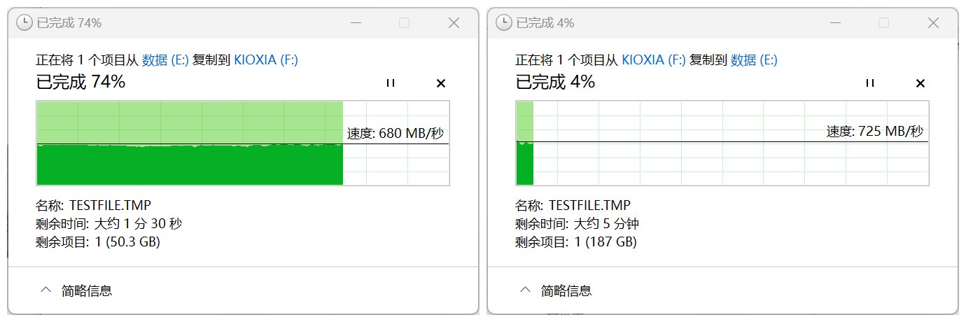 在实际拷贝数据中,我使用的笔记本采用Windows 11 23H2版本,从电脑硬盘往固态硬盘读写数据文件,实测写入读取速度分别为680MB/s与 725MB/s,实际上系统读写由于电脑的差异比基准测试要慢一些都是正常的。