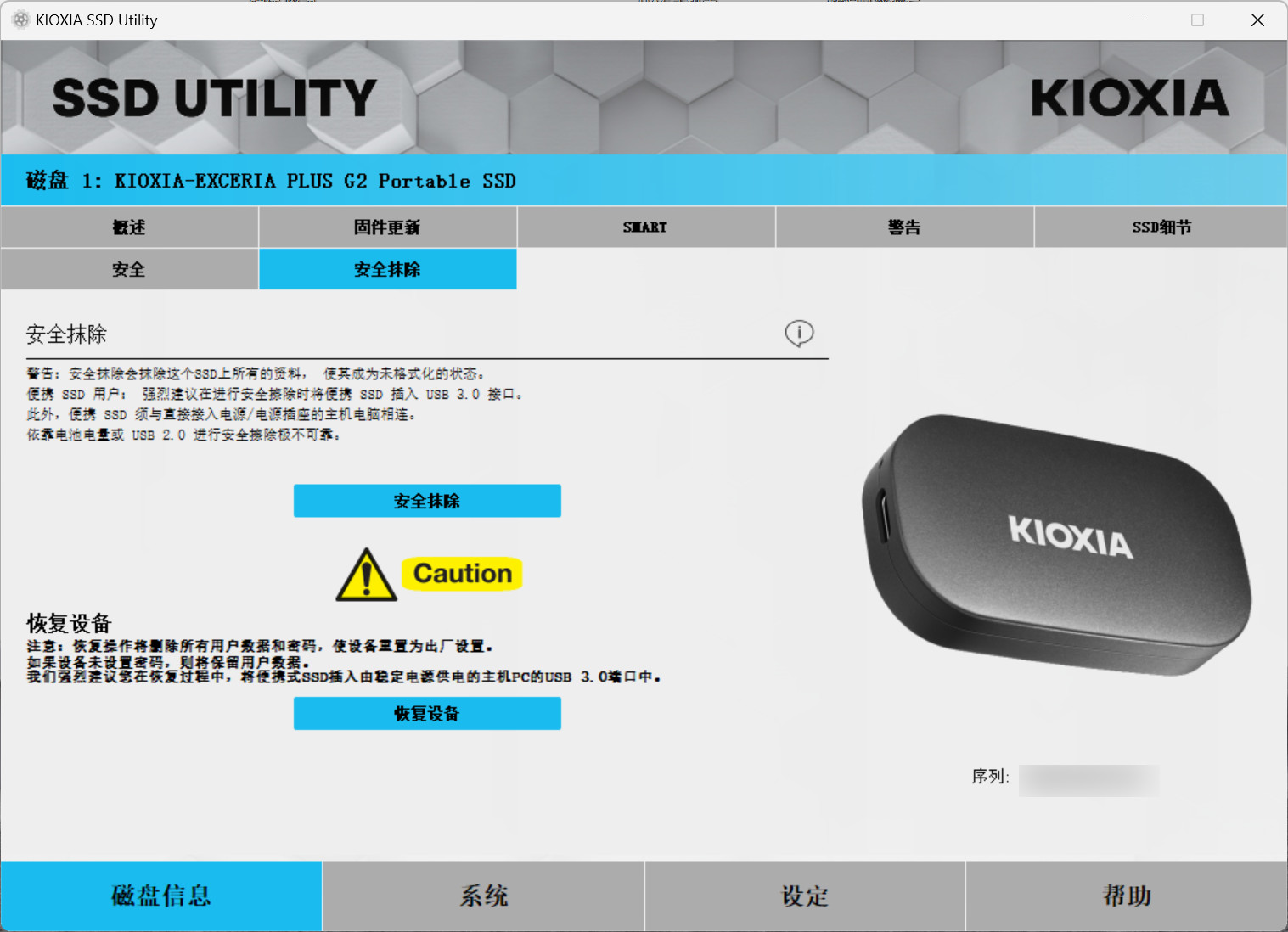 此外,使用SSD Utility也可以对硬盘的状态信息进行查看,例如利用的空间、温度以及设备健康度等方面。同时我们还可以使用内置的程序对硬盘进行固件更新或者安全抹除,特别是安全抹除功能的加入使得我们出借硬盘给其他人时,可以有效保证删除数据不再被恢复。